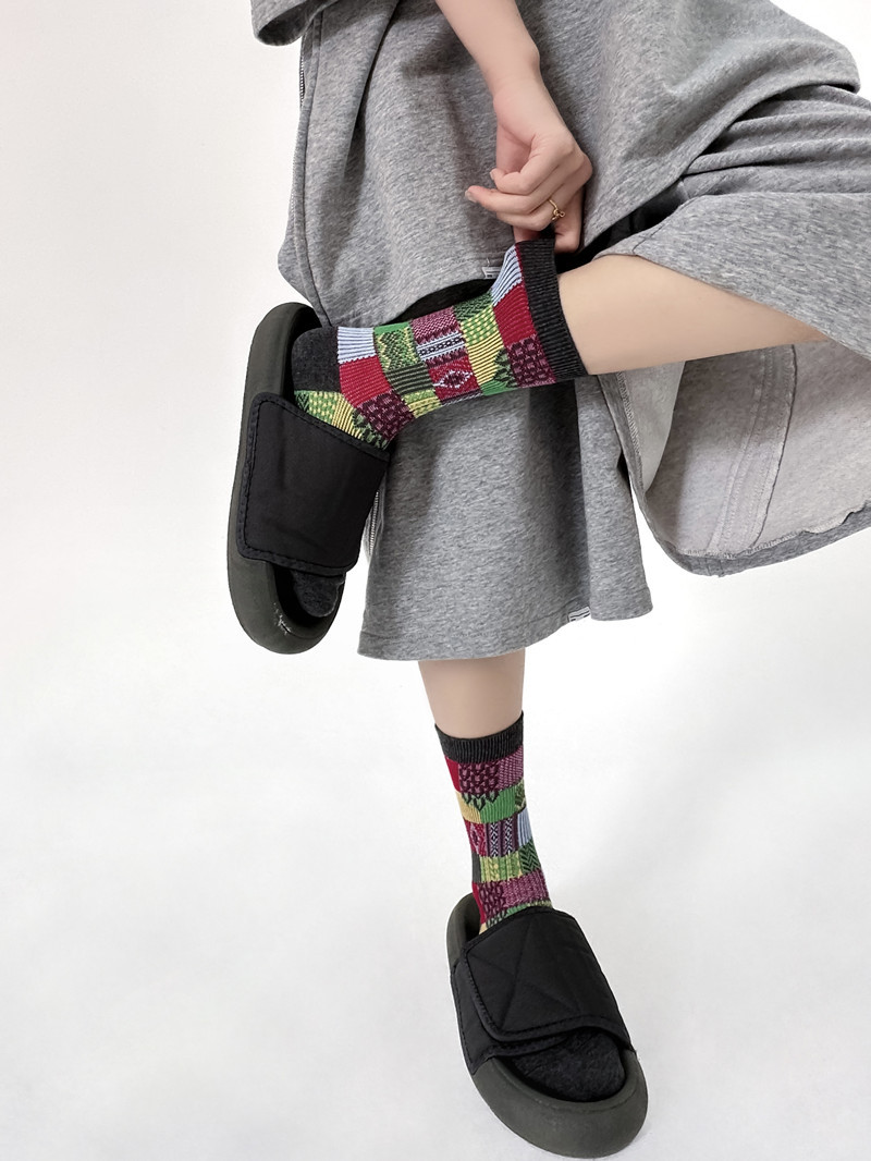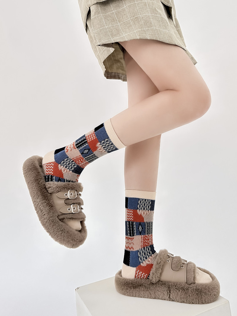 Each pair features a unique patchwork pattern in rich, retro tones, giving off a handcrafted, artisanal vibe. The set includes four distinctive color combinations: beige mix, green mix, blue-gray mix, and wine red mix — versatile shades that pair effortlessly with boots, sneakers, or casual shoes. Whether for work, outdoor adventures, or lounging at home, these socks bring both function and style to your wardrobe.