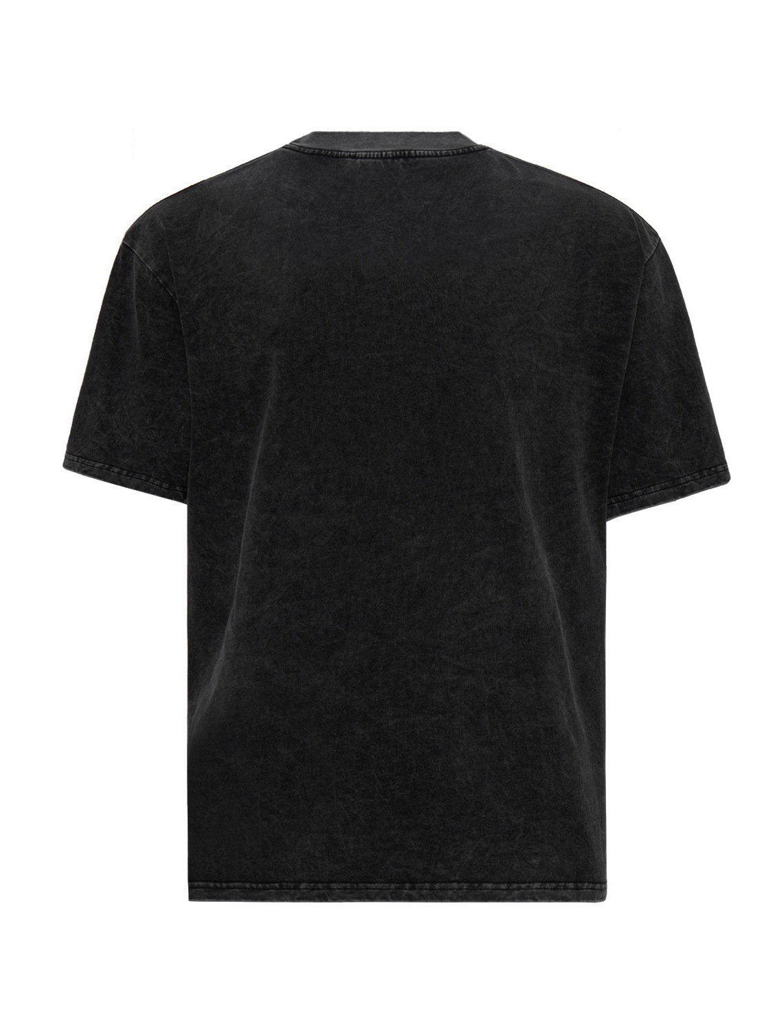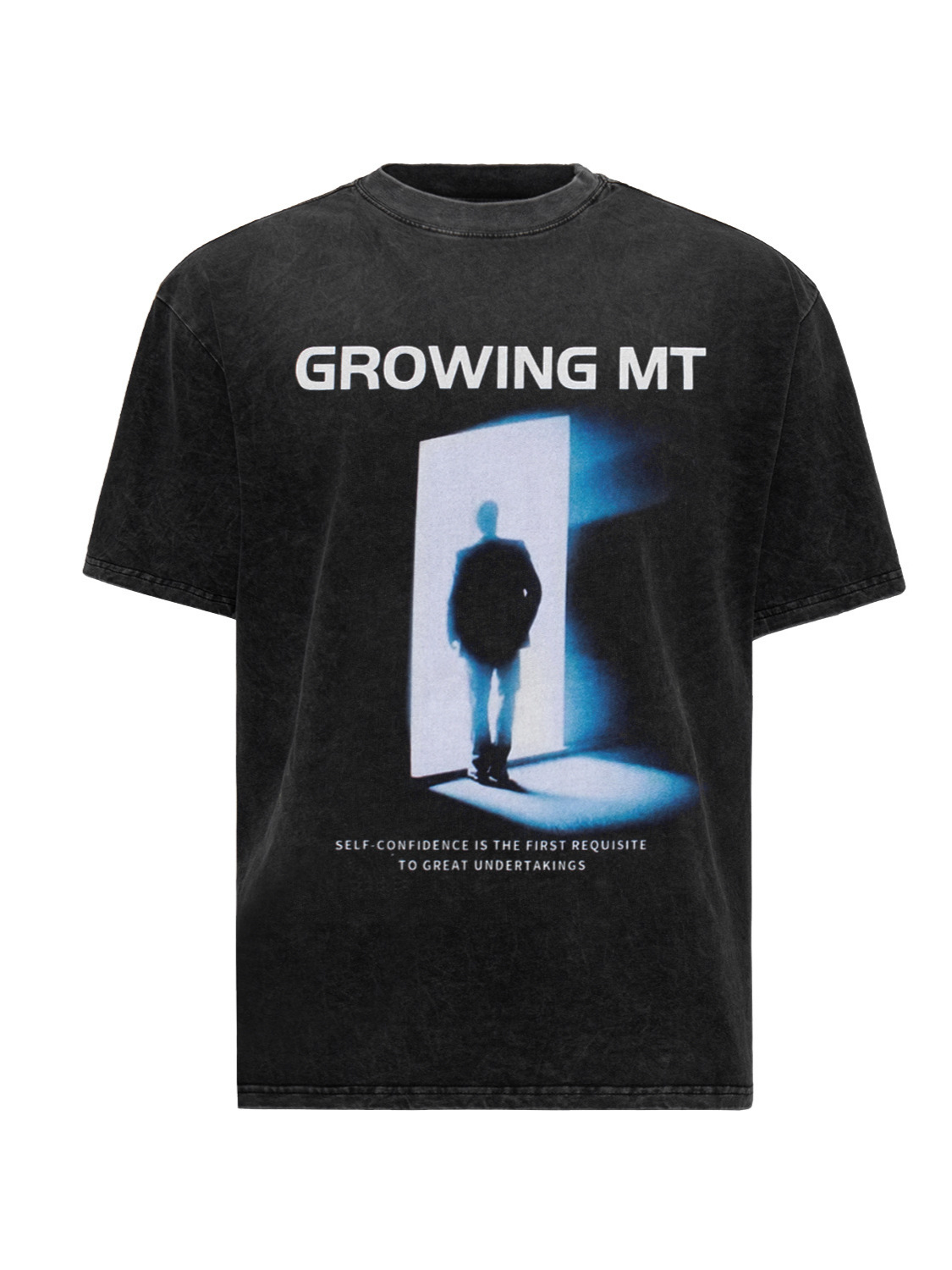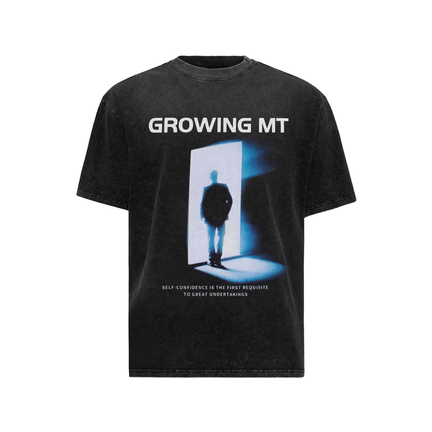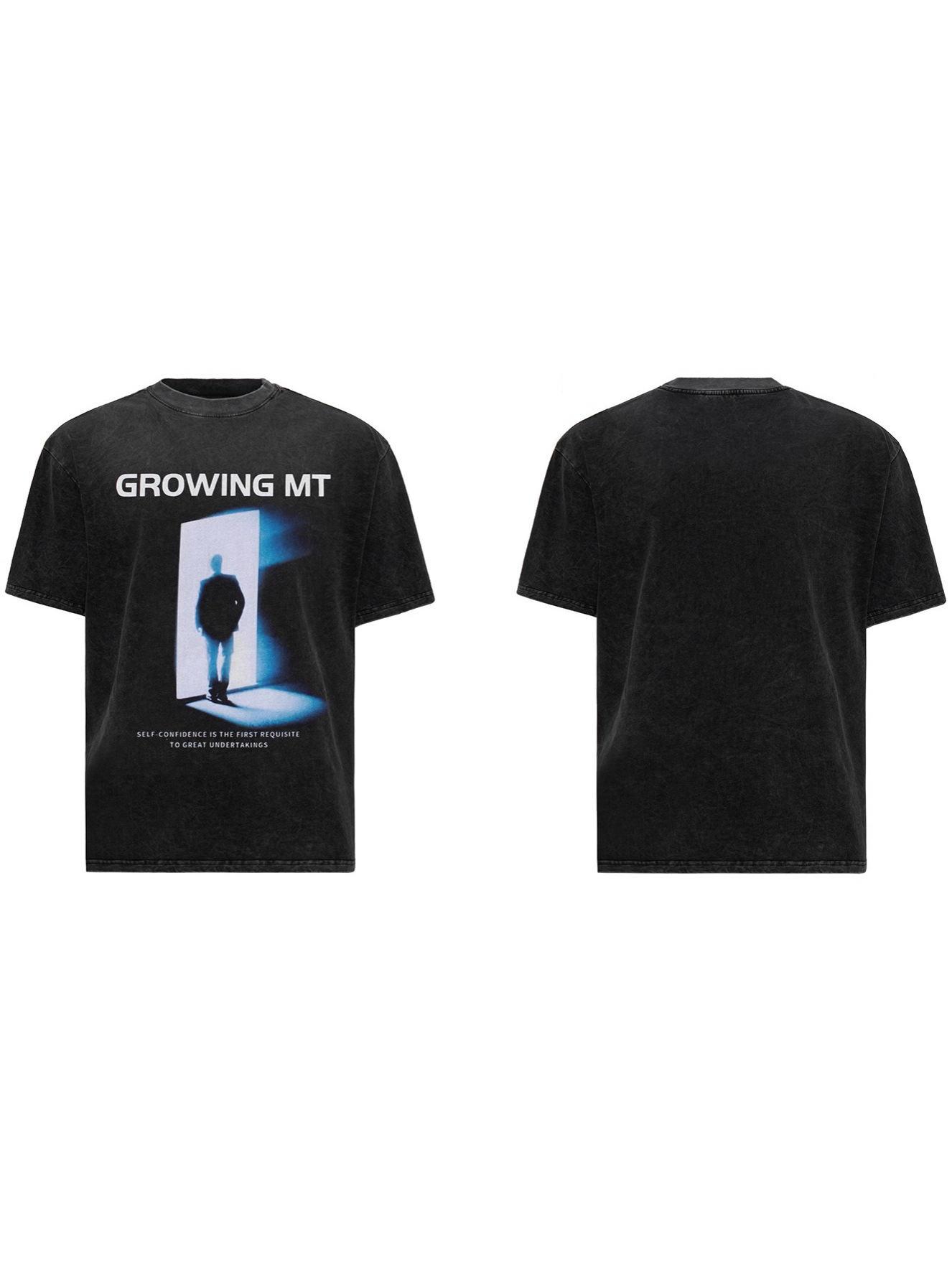 This black washed-effect T-shirt delivers a stylish blend of retro texture and modern streetwear attitude. The fabric features a subtle faded look created by the washing process, giving it a naturally vintage and worn-in appearance. On the front, the bold “GROWING MT” lettering stands out, paired with a striking graphic of a silhouette walking toward a bright doorway — a design filled with futuristic vibes and symbolic meaning.