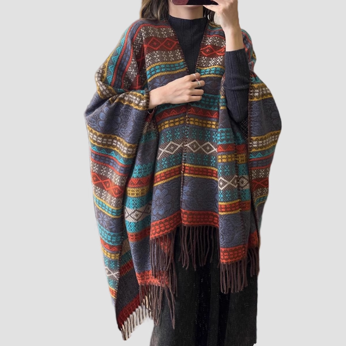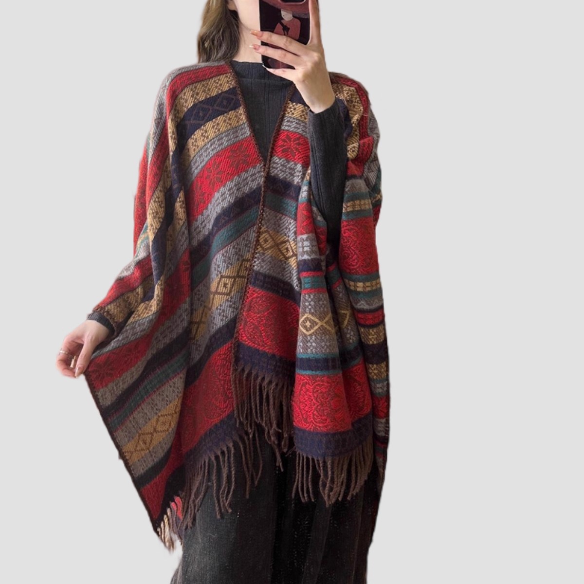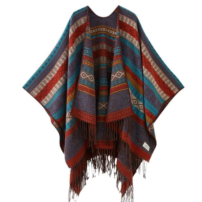Designed with a wide cape-style cut, it provides great coverage and a natural draped effect that flatters all body shapes. The open-front design makes it easy to put on, while the long tassel hem adds elegance and movement as you walk.