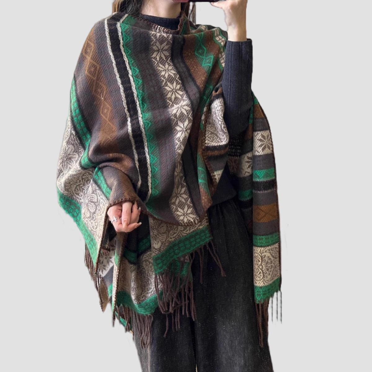 This ethnic-style thickened shawl blanket is crafted from a soft, warm knitted fabric that offers excellent comfort and insulation during autumn and winter. The wrap features an eye-catching combination of vintage geometric patterns with layered colors like green, brown, beige, brick red, and blue, creating a bold, stylish, and unique look.