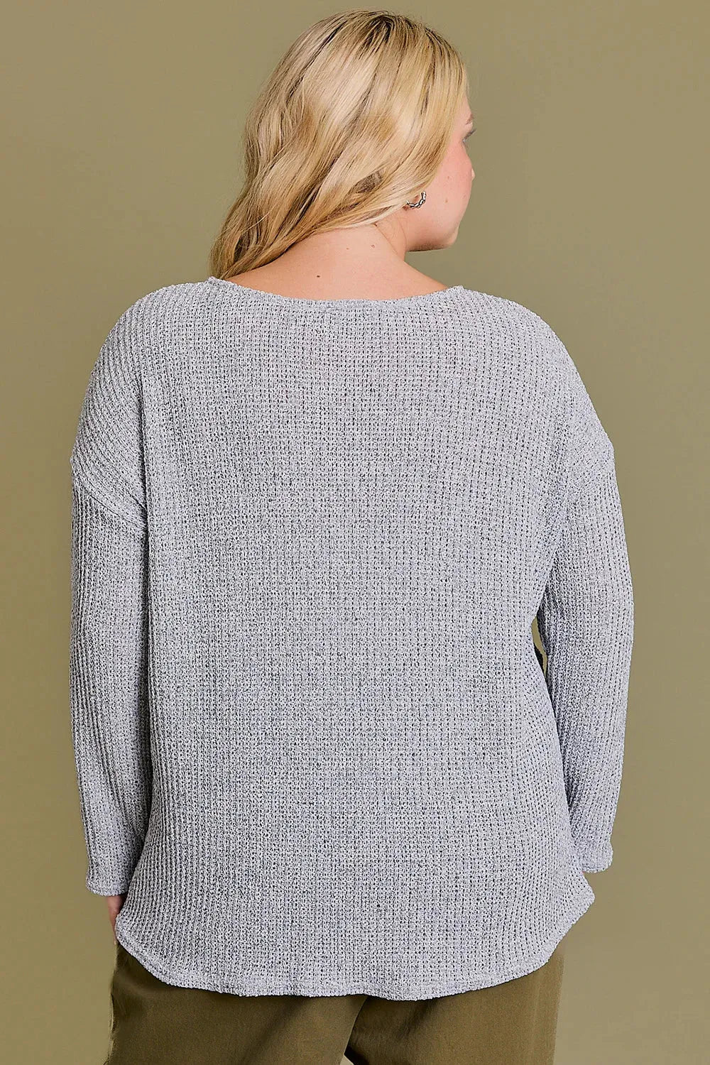 Plus Size Gray Textured with Side Slits Relaxed Fit Long Sleeve Knit Sweater Top