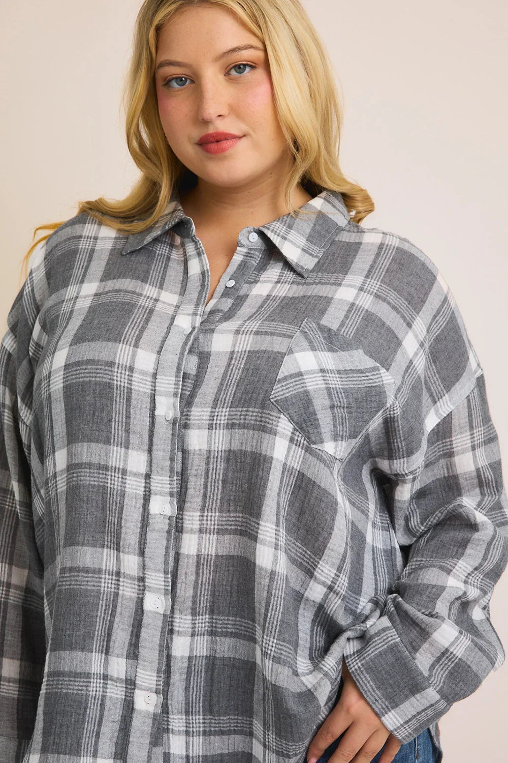 Stay effortlessly cool with our Plus Size Cotton Grey White Plaid Oversized Button Down Shirt. This classic flannel-inspired plus size wholesale boutique shirt features a timeless grey and white plaid pattern in ultra-soft fabric that’s perfect for layering or wearing solo. Perfect for boutique owners seeking trendy plus size casual fashion that appeals to customers who love versatile wardrobe staples, this oversized plaid shirt brings comfort and style together beautifully.