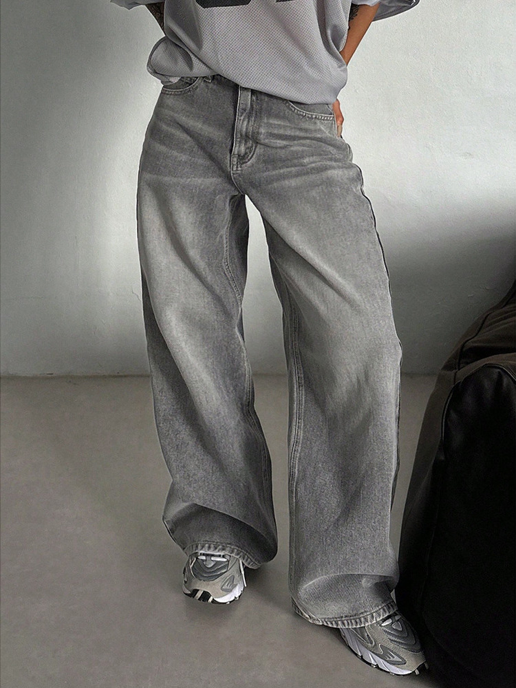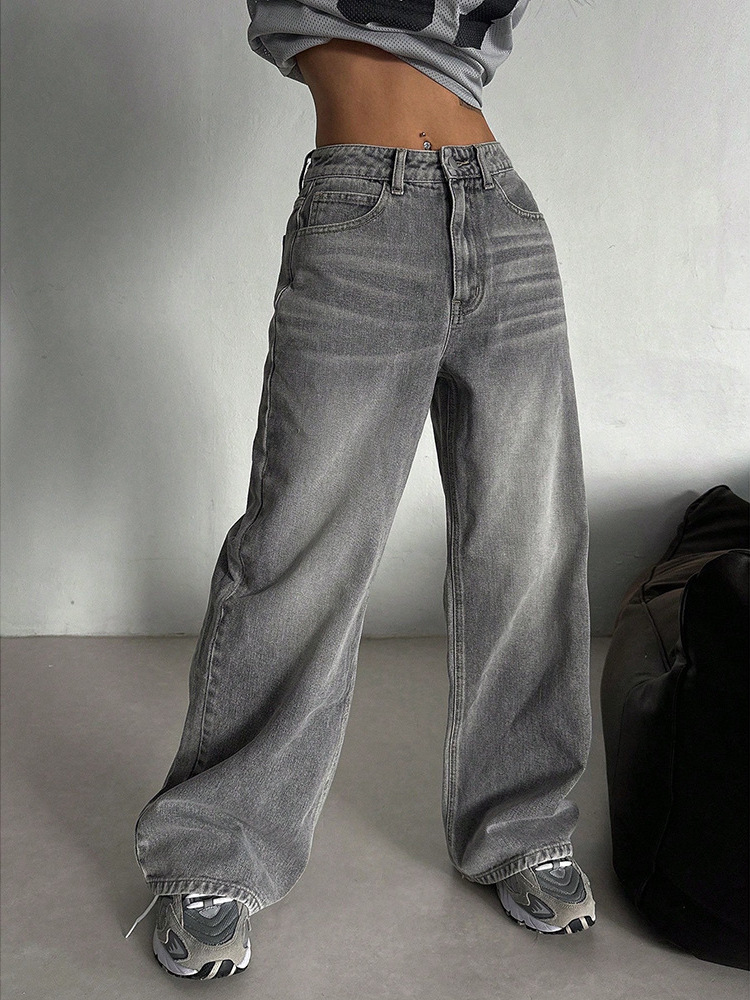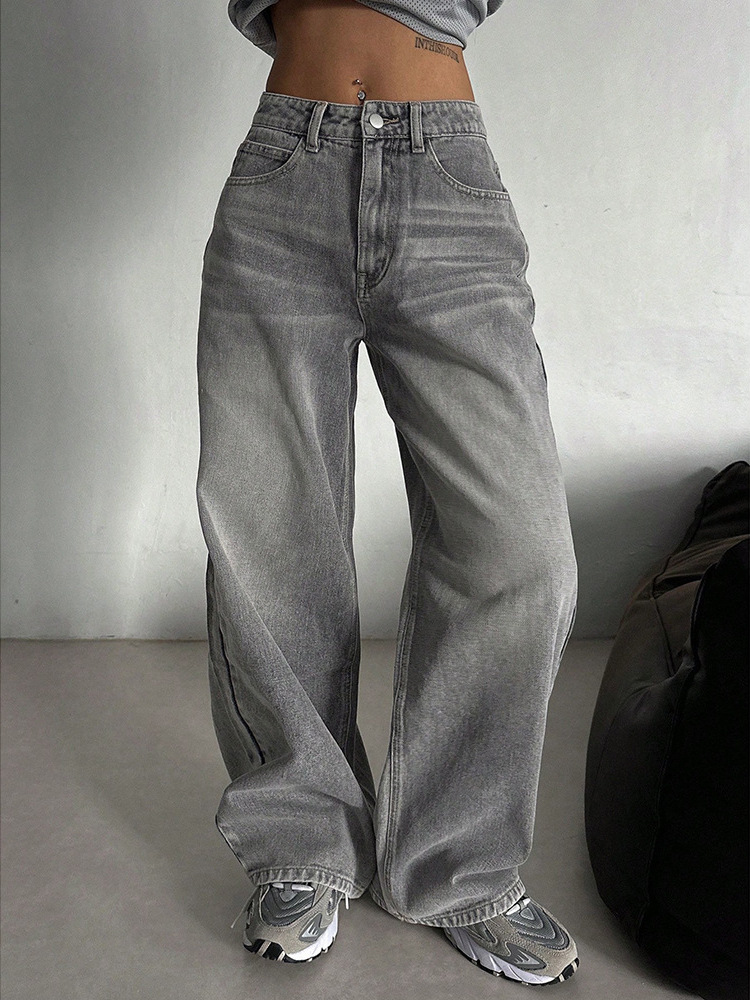 These high-waisted grey wide-leg jeans feature a vintage washed texture that creates a stylish, cool, and effortless look. Designed with a high-rise waist, loose straight silhouette, and floor-length wide legs, these jeans elongate your legs instantly and flatter all body shapes.