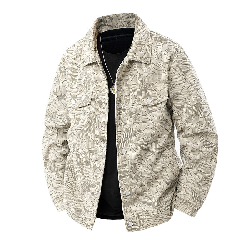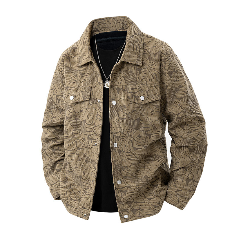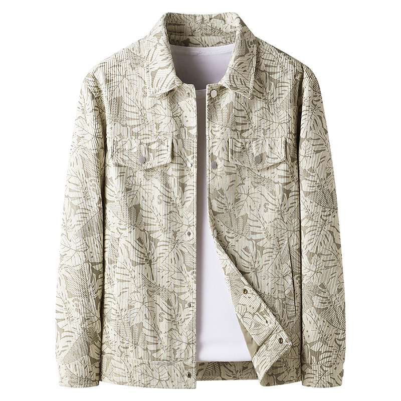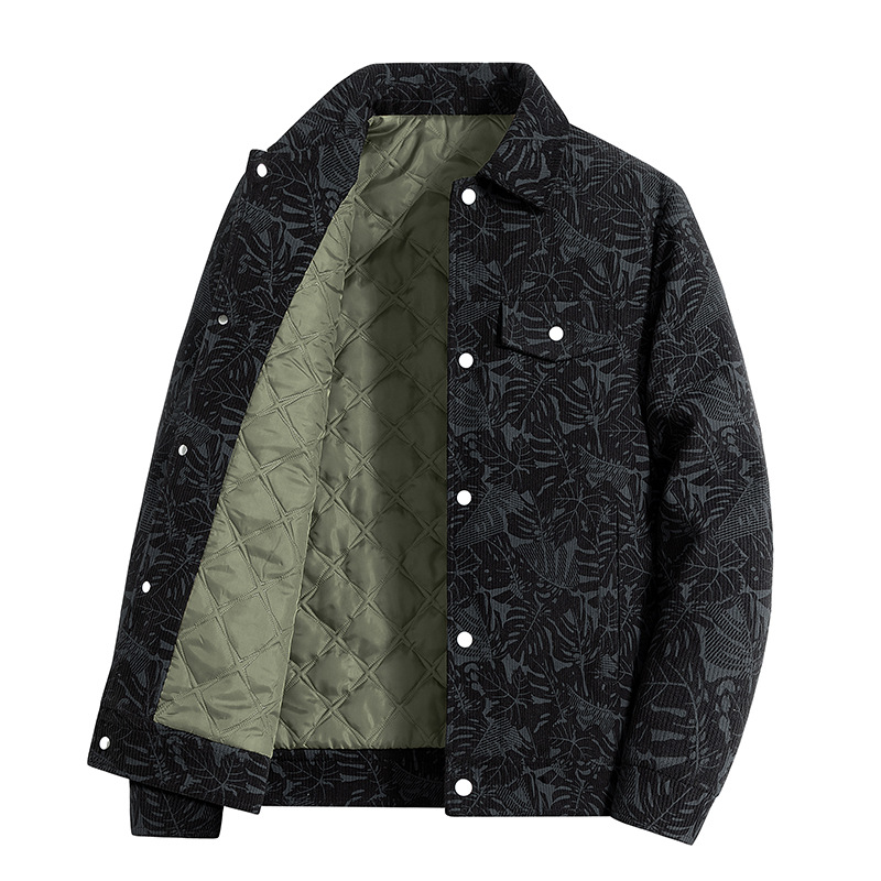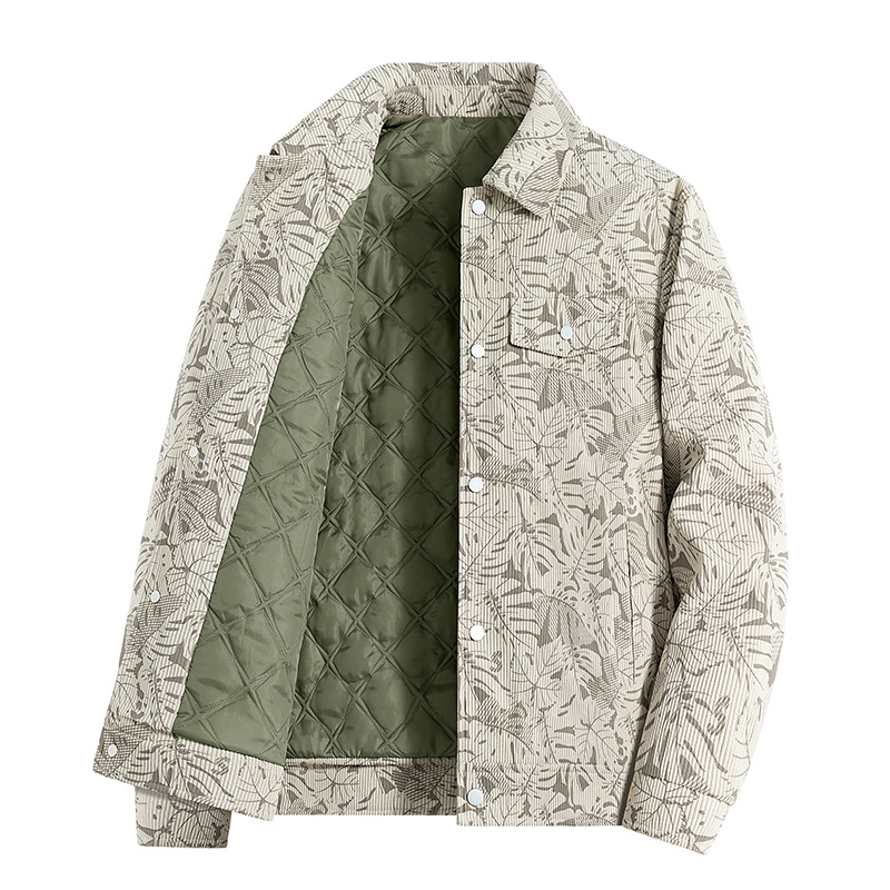 This men’s warm printed jacket features a textured flocked pattern fabric with a stylish botanical and geometric print. The surface is soft yet durable, ideal for daily wear throughout autumn and winter. The interior is designed with diamond-quilted insulation, offering lightweight warmth and excellent heat retention without feeling bulky.