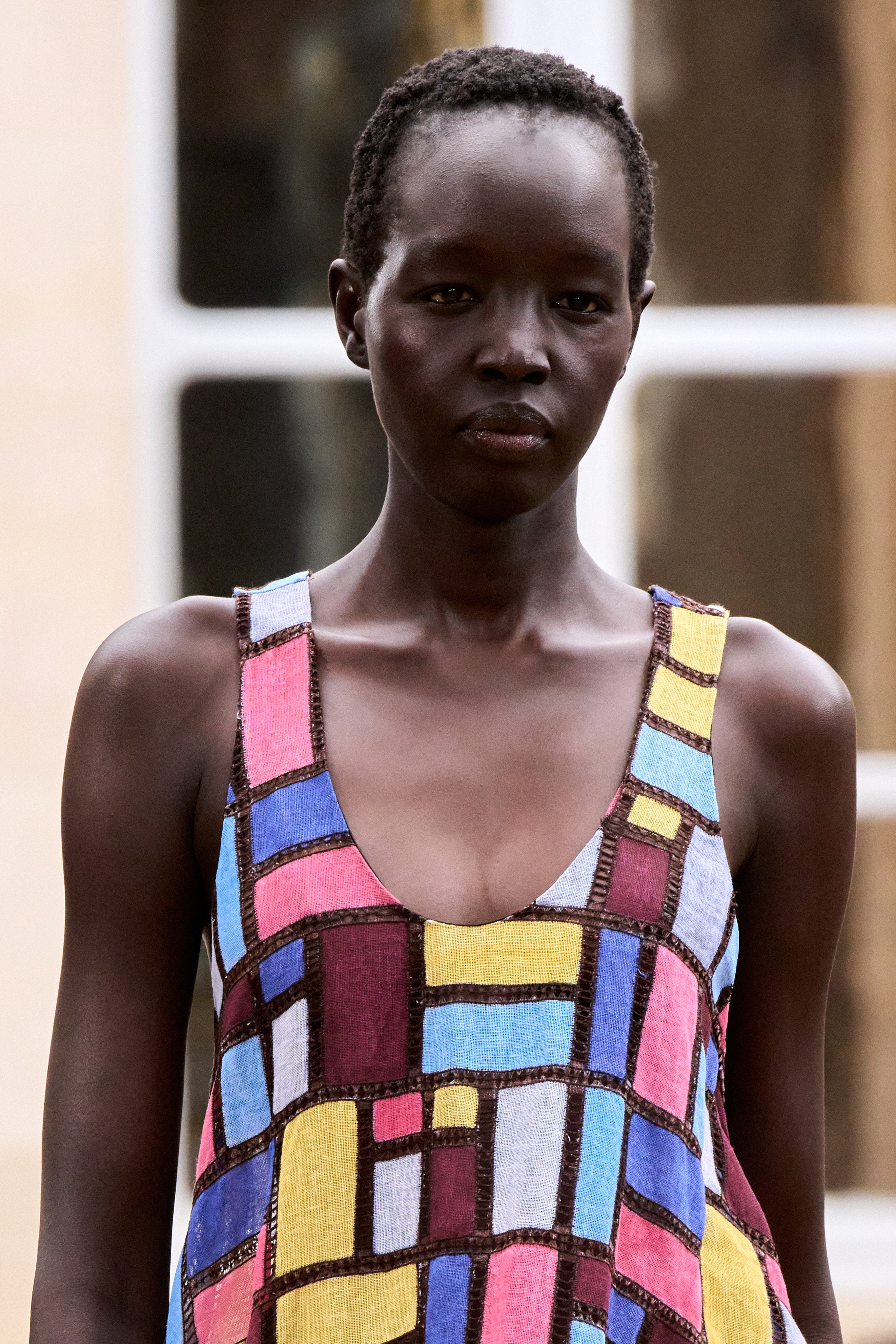A multicolored technique titled “Let it Rip” translates a geometric drawing by Gabriela named Aurora is interpreted into a flowing tank dress made of hand-manipulated linen yarns, where colors are hand-painted on each strand to create a patchwork of rectangles separated by hand-embroidered ladders and frays. A team of 40 artisans comprising of 30 embroiderers and 10 painters worked together to achieve the panels.