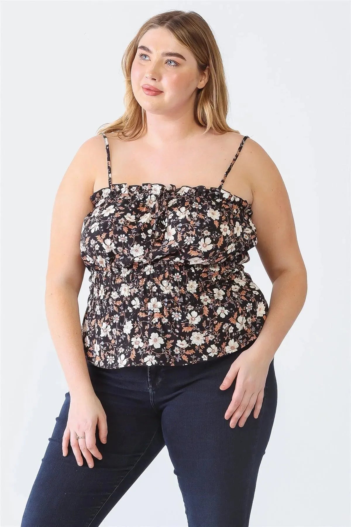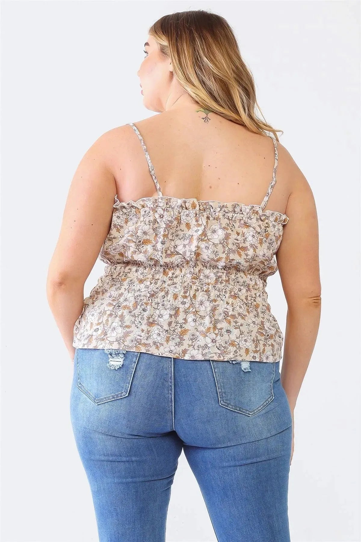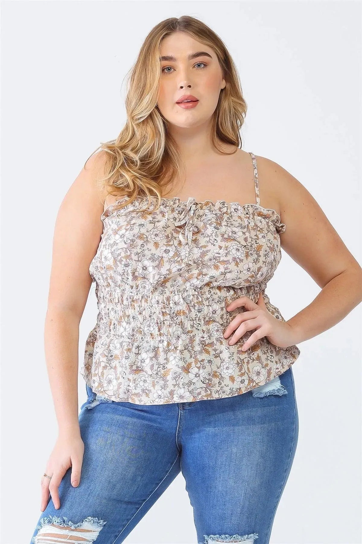 Plus Size Blush Floral Print Ruffle Trim Smocked Bodice Cami Top