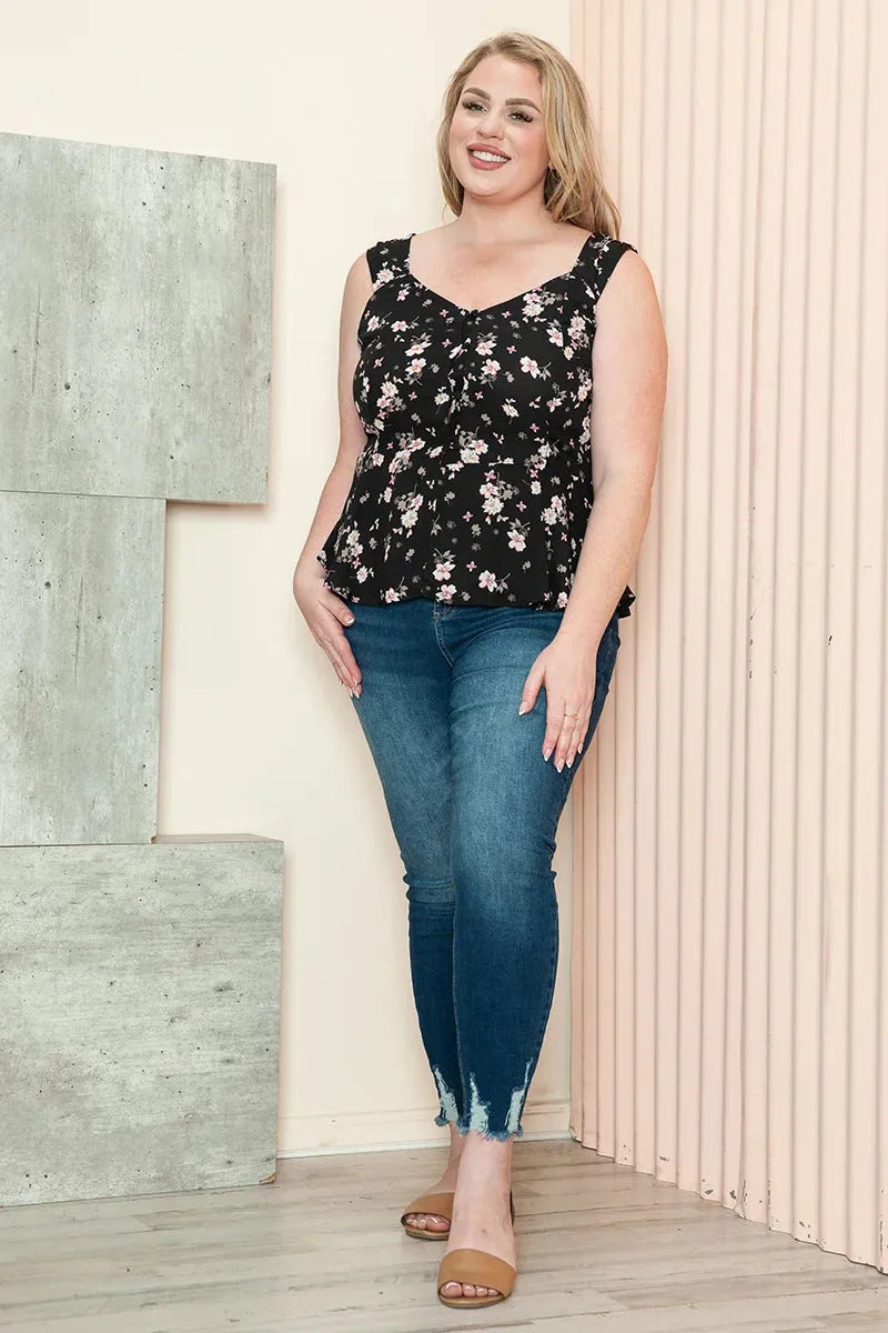 Junior Plus Size Floral Print Sweetheart Neckline Peplum Sleeveless Summer Top