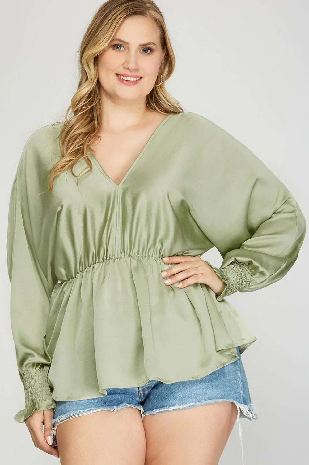 Plus Size Silky V-Neck Smocked Cuffs Peplum Blouse – Elegant Flowy Top