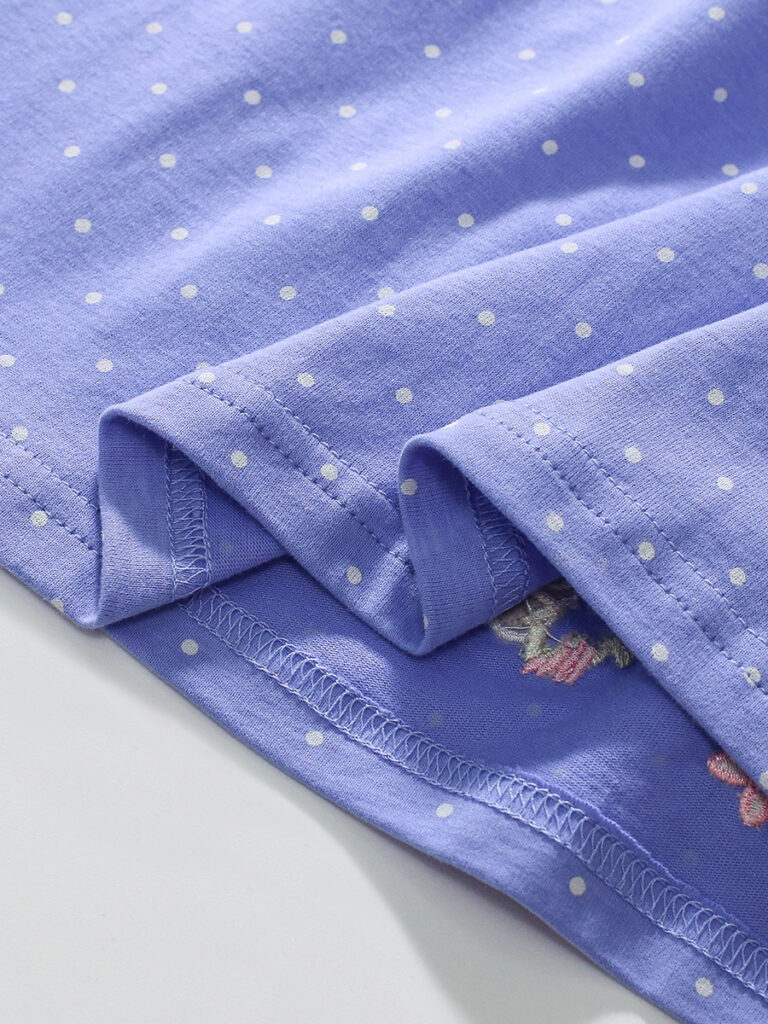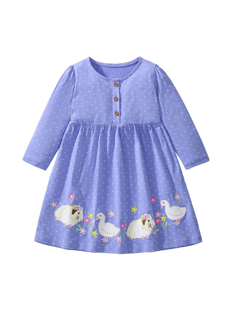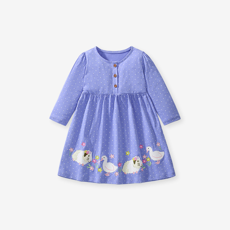 This adorable purple baby dress features tiny white polka dots and playful embroidered sheep and duck motifs along the hem. Made from soft and breathable cotton, it ensures maximum comfort for your little girl during spring and autumn.