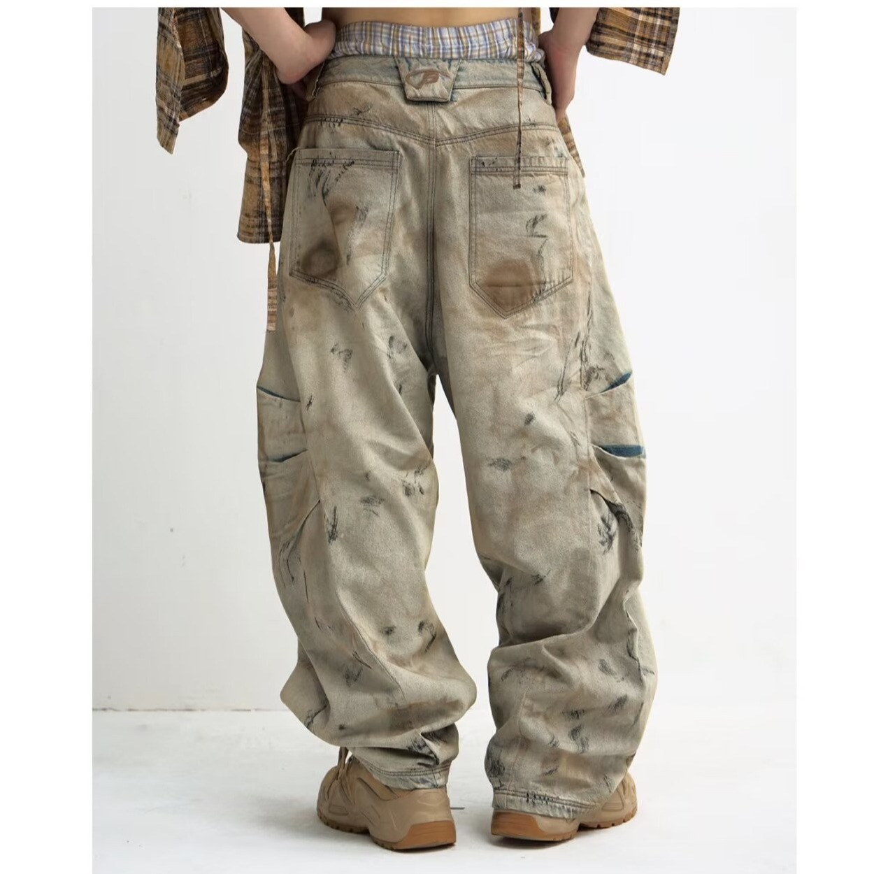 These Vintage Distressed Oil-Stained Cargo Pants feature a bold industrial-inspired design with hand-crafted dirty-wash textures and oil-stain effects, giving each pair a unique aged look. The exaggerated oversized silhouette creates a natural stacked effect at the hem, offering both comfort and an eye-catching streetwear profile.