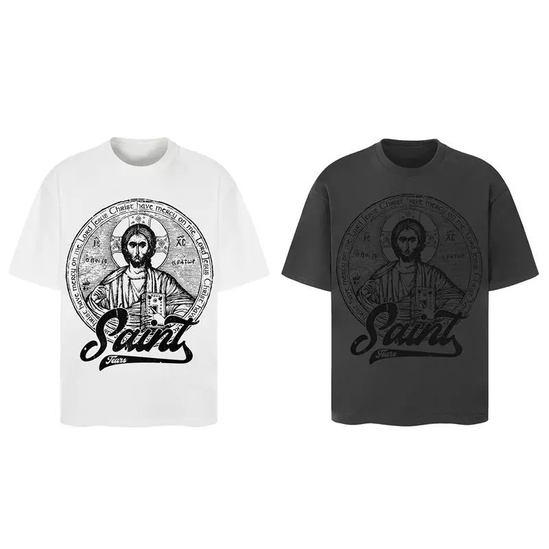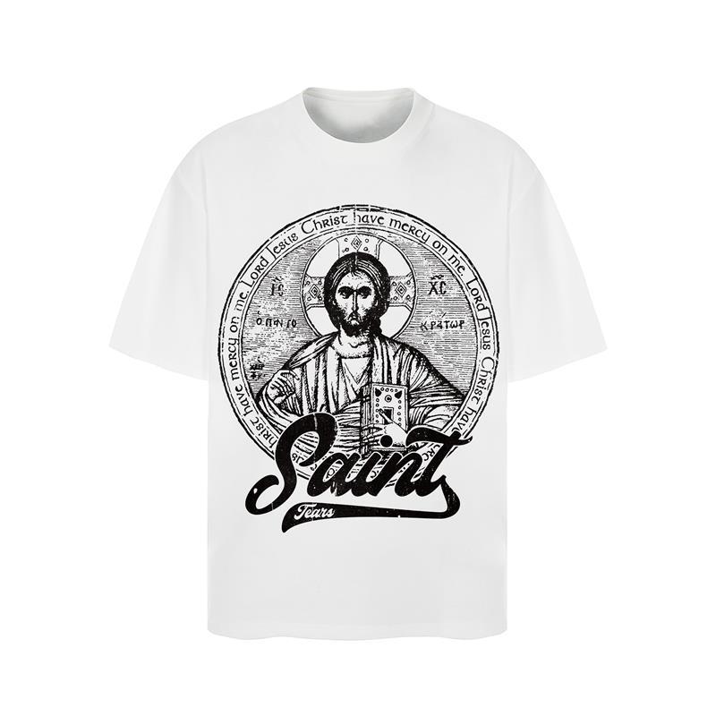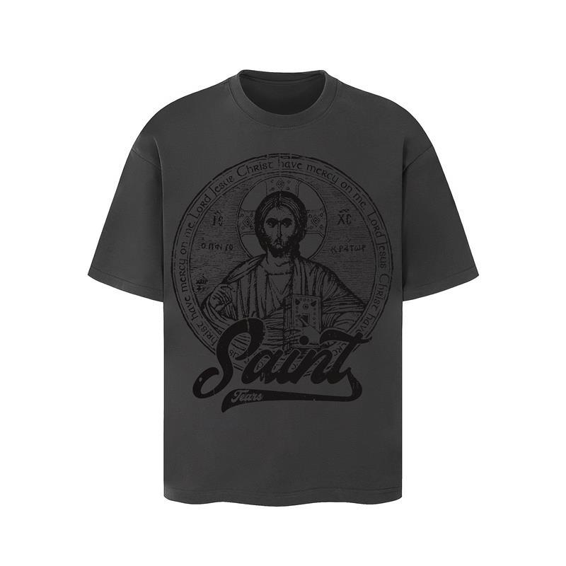 This vintage saint icon graphic T-shirt combines classical religious illustration with modern streetwear aesthetics. The front features a large engraving-style saint artwork with refined lines and rich details, giving the piece strong artistic character. Below the illustration, the bold “Saint Tears” script adds a contemporary edge, blending sacred imagery with street fashion attitude.