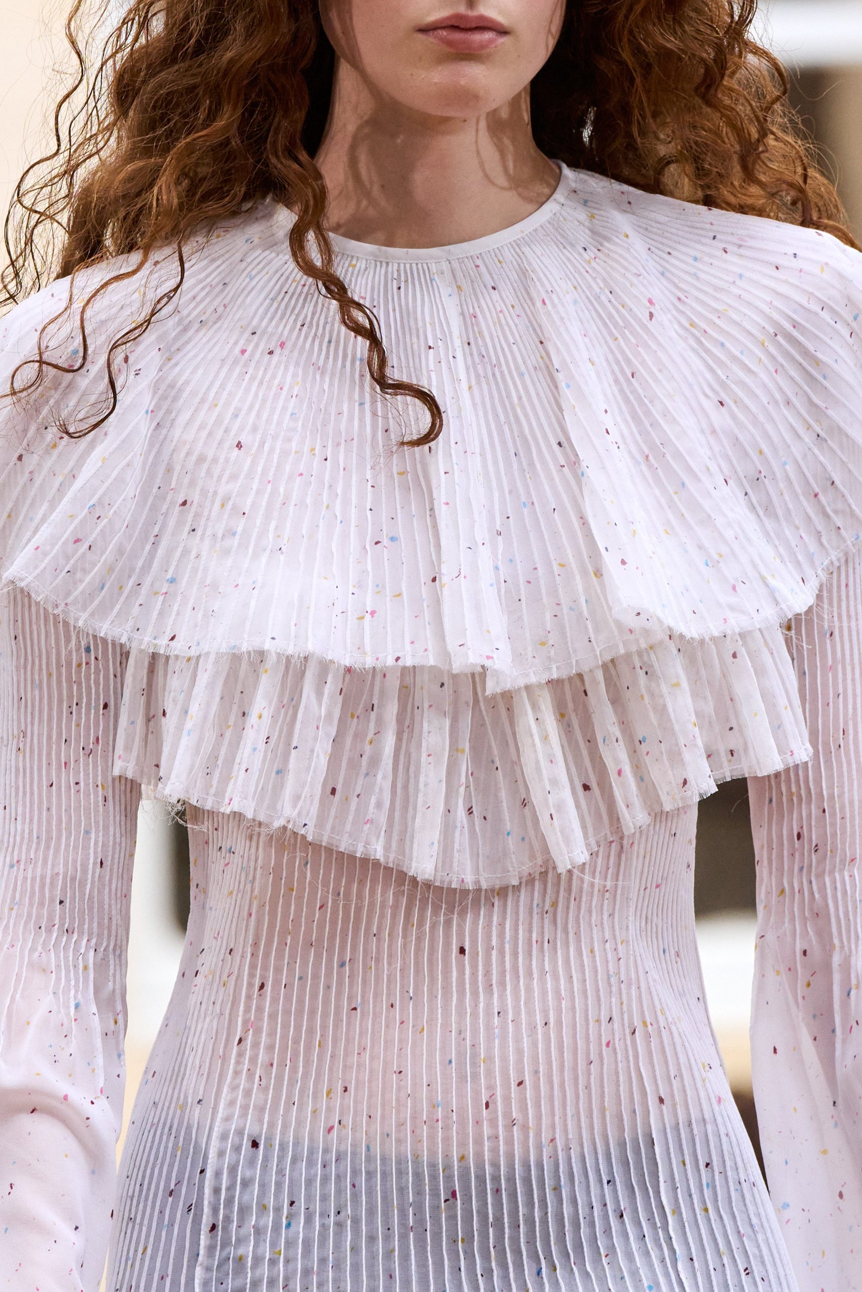 A multi-printed speckle silk georgette is engineered with pintucks through the waist and neckline to create a fluttering form that flatters the wearer and skims the waist and hips.