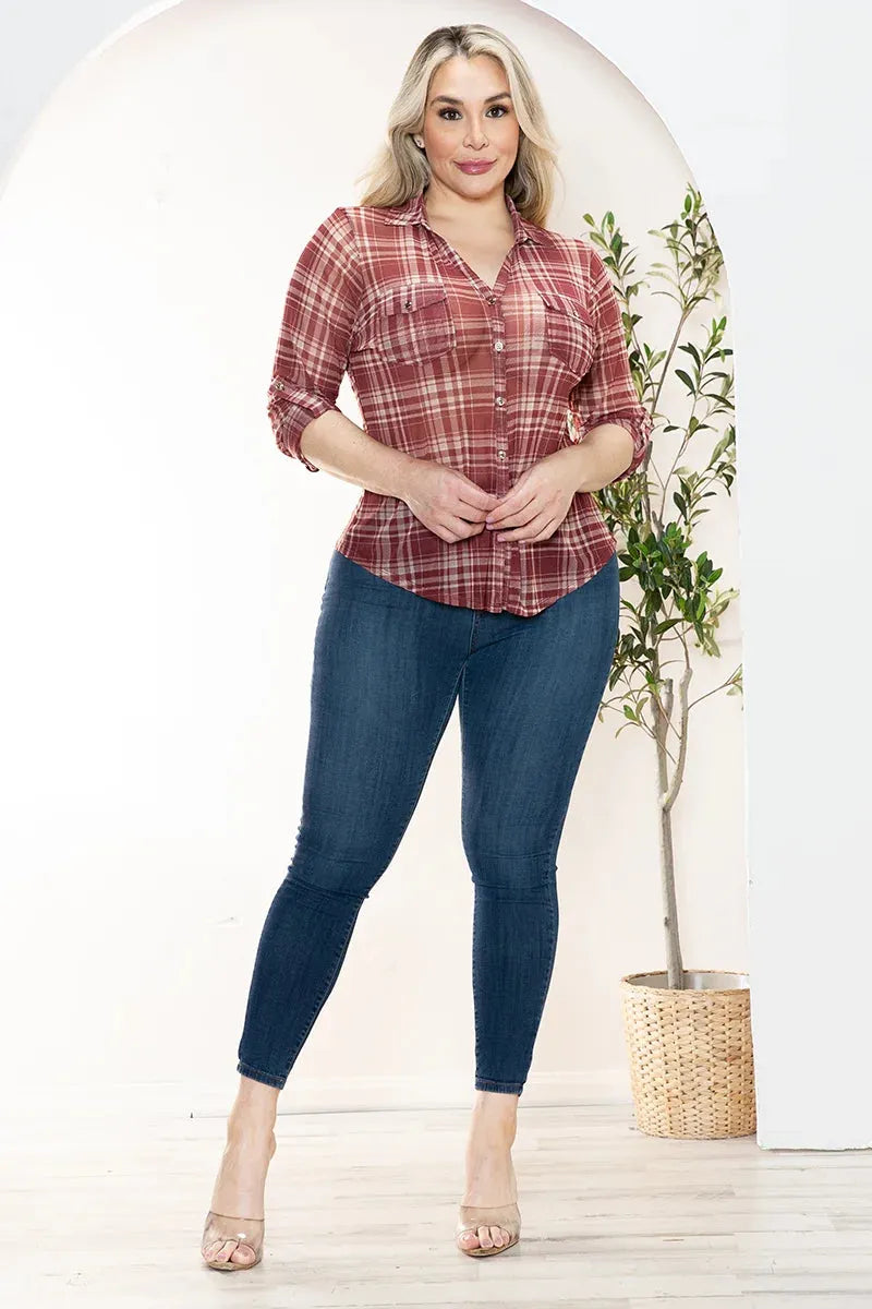 Plus size top: plaid, long sleeve, see through, chest pockets with button, metal button, light weigh, collared, This chic trendy top is suitable for any lifestyle and occasion. You will look and feel as glamorous as your favorite celebrity does. Wherever you are in this iconic, classic, and fancy top, you will be receiving compliments! The top is slimming and flatters any body shape.