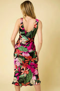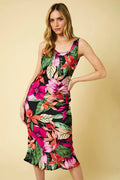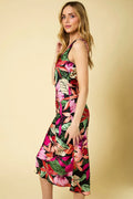 This Tropical Floral Sleeveless Satin Midi Dress exudes elegance and vibrancy, perfect for warm-weather occasions. Crafted from luxurious satin, it features a stunning tropical floral print that adds a touch of exotic charm. The sleeveless design ensures comfort and breathability, while the midi length offers a sophisticated silhouette suitable for both casual outings and formal events. Ideal for pairing with sandals or heels, this dress is a versatile addition to any wardrobe, making it a must-have for those who appreciate style and comfort.