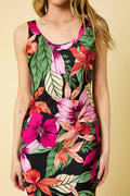 Women summer dress: tropical floral print, midi length, sleeveless, tank style, scoop neckline, satin material has no stretch, lined, A-line. Stay stylish and comfortable all summer long with this beautiful dress, designed to make you feel effortlessly elegant!
