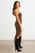 🖤 Add a little wild to your wardrobe with our Animal Print Shiny Cut-Out Wrap Midi Dress. With its playful cut-outs and eye-catching print, you'll stand out in any crowd. Perfect for a night out or a special occasion.