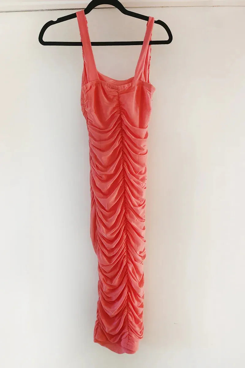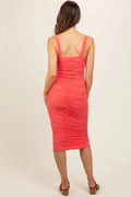 Coral Red Spaghetti Strap Ruched Bodycon Midi Dress