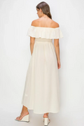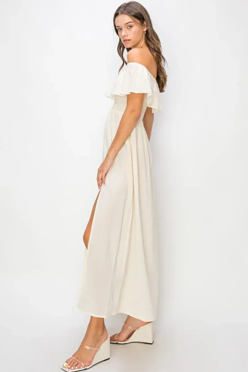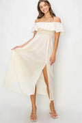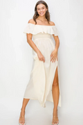 This Ruffle Tiered Off Shoulder Side Slit Smocked Midi Dress combines elegance and comfort, making it a perfect choice for various occasions. The off-shoulder design highlights the neckline, while the tiered ruffle detailing adds a playful touch. Crafted with a smocked bodice, it ensures a flattering fit, and the side slit provides a hint of allure. Ideal for summer outings or casual gatherings, this dress effortlessly blends style with ease of wear.