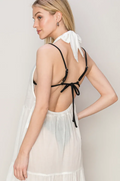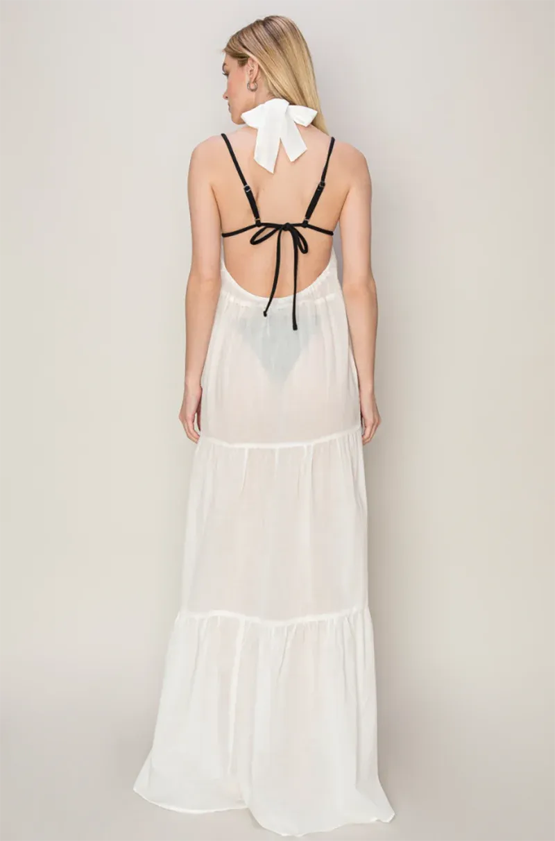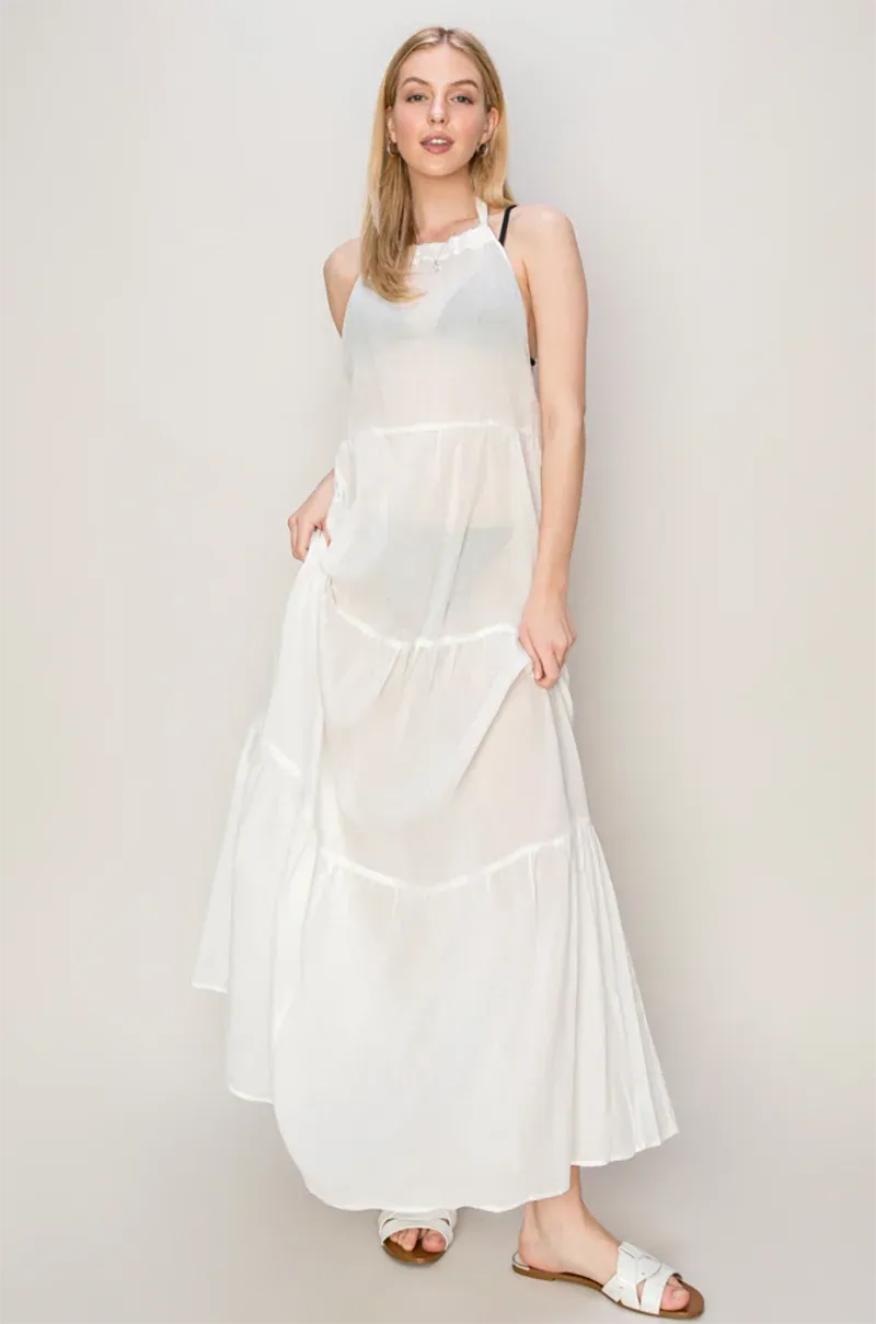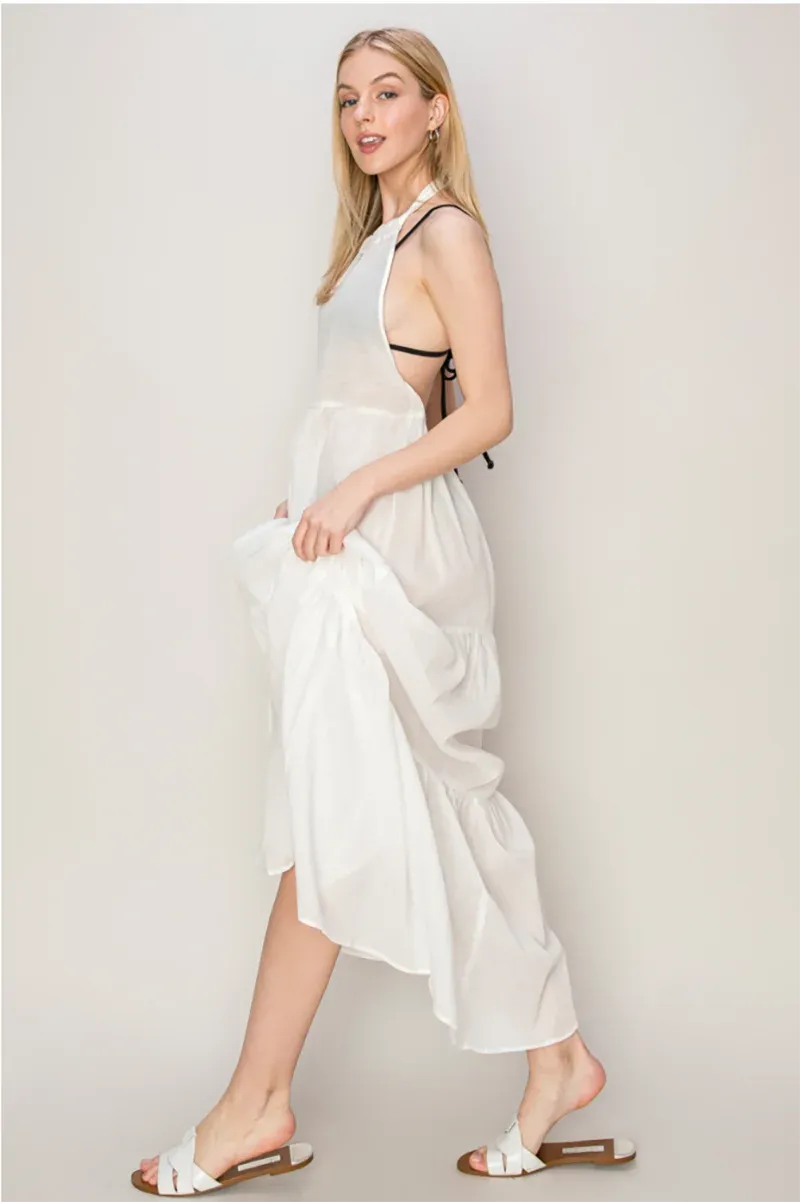 Women dress: cover up, sleeveless, maxi length, halter neck, tied backless, semi-sheer, no stretch, boho style, cute, chic, Perfect for beach and festival look in spring and summer !. Whether you are heading to the beach, the boardwalk, or a little outing with your girlies, this oh-so-perfect neutral dress will be sure to turn heads!