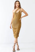This playful midi dress in a rich black shade is sure to turn heads with its one-shoulder design and unique cut-out neckline. The ribbed fabric adds texture, while the ruching detail offers a flattering fit. Perfect for a night out, this dress is both stylish and comfortable.